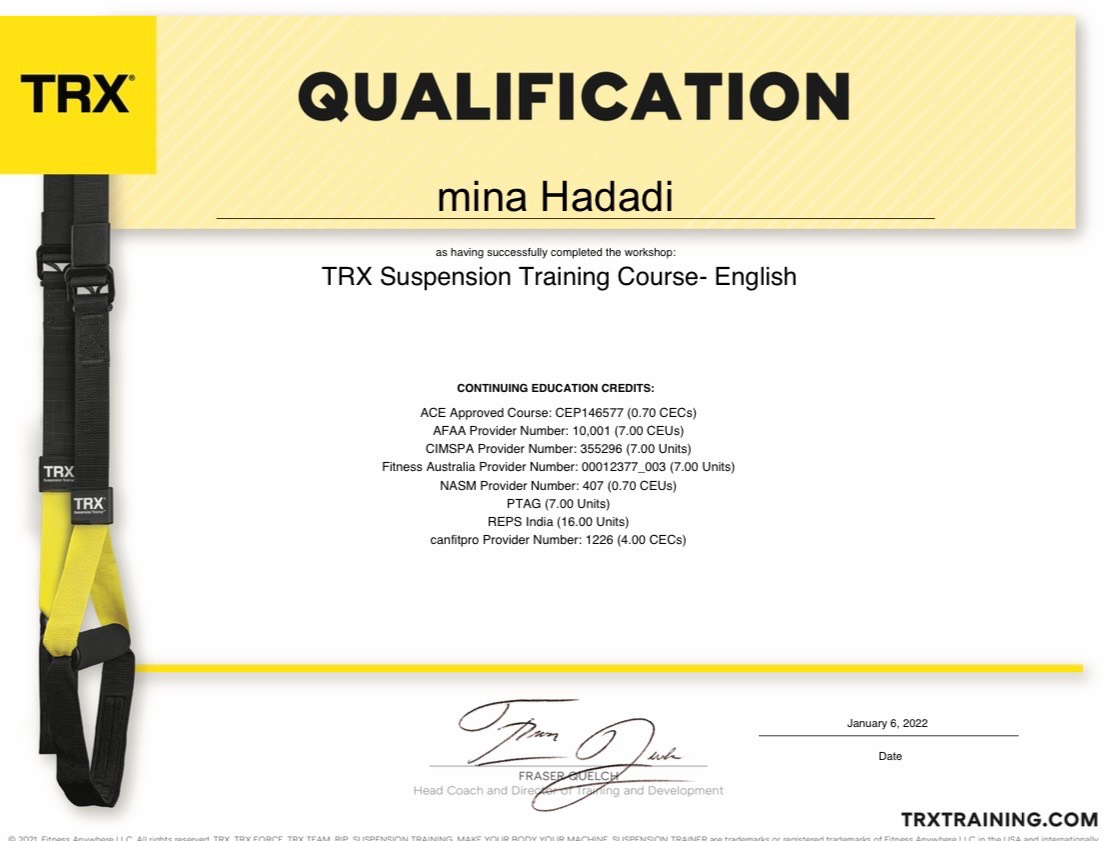 مینا (عسل) حدادی مربی حرفهای و باتجربه در حوزه تمرینات تخصصی و EMS است که با پشتوانهای قوی از مدارک معتبر داخلی و بینالمللی فعالیت میکند. ایشان دارای مدرک بدنسازی از فدراسیون پرورش اندام تهران، مدرک مربیگری شنا از فدراسیون IASF، مدرک نجات غریق از فدراسیون نجات غریق تهران (ILS)، مدرک داوری شنا از فدراسیون IASF و همچنین مدرک مربیگری آبدرمانی از دانشگاه علوم تحقیقات تهران (پونک) میباشد. ترکیب دانش آکادمیک، تجربه عملی و تسلط بر اصول علمی تمرین، باعث شده تا تمرینات زیر نظر ایشان با بالاترین سطح ایمنی، استاندارد و اثربخشی انجام شود.