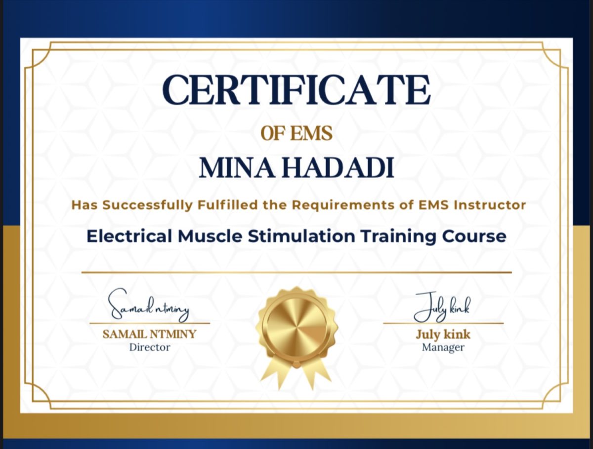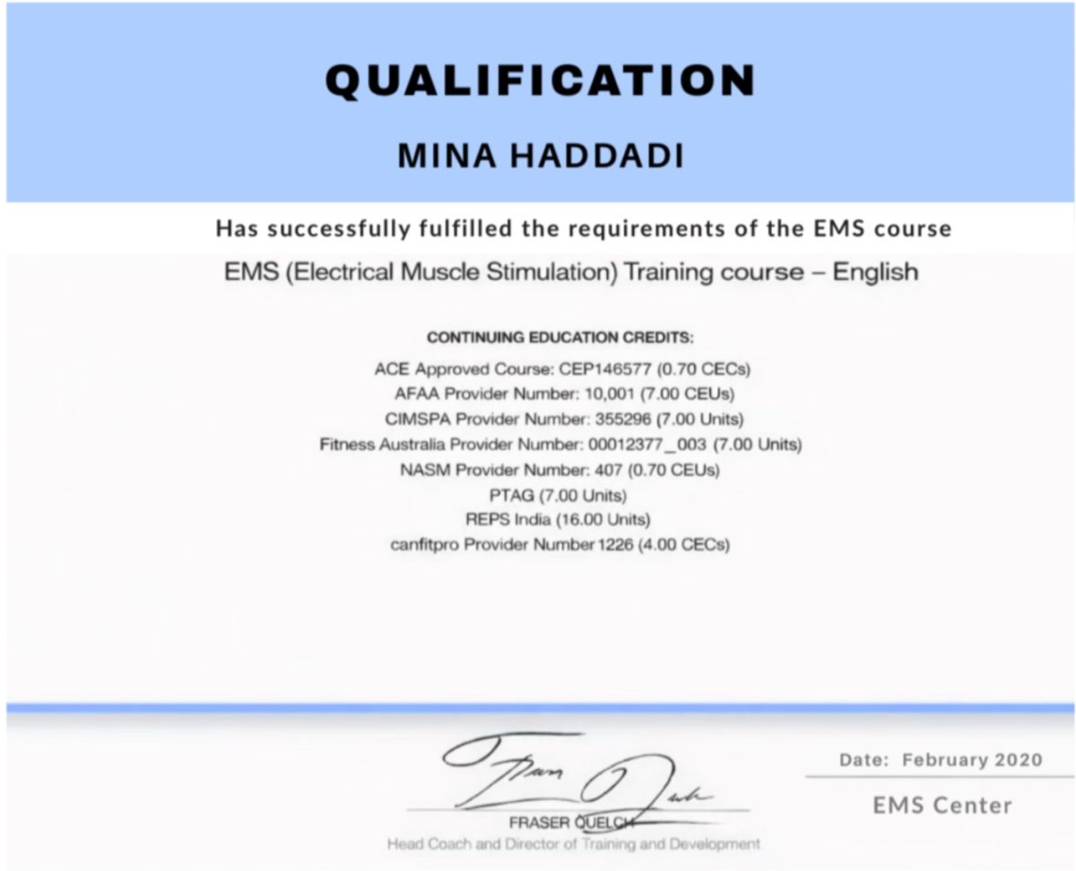 از طرف دیگر، انجام تمرینات EMS حتماً باید زیر نظر مربی متخصص و دارای دانش علمی بهروز انجام شود. به همین دلیل، تمرین با عسل حدادی بهعنوان مربی رسمی EMS با مدرک بینالمللی، یک انتخاب هوشمندانه و مطمئن است. تجربه، تخصص و نظارت دقیق ایشان باعث میشود تمرینات شما کاملاً اصولی، ایمن و متناسب با استانداردهای جهانی EMS باشد.